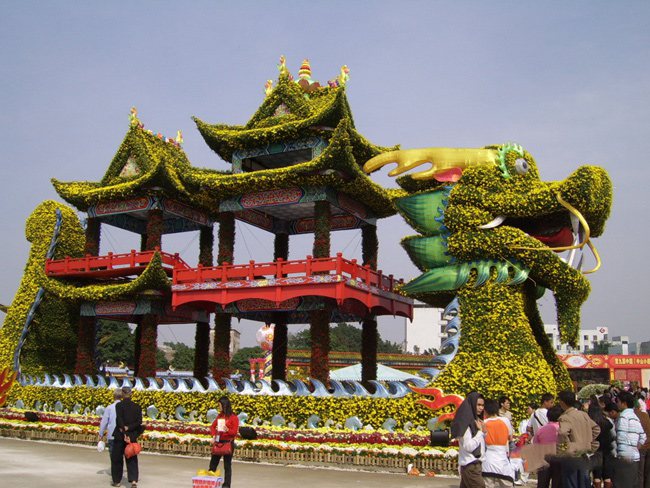 开封市大广五色草造型有限公司于开封市祥符区陈留镇尹庄村,现拥有菊花品种1500个。年生产菊花种苗500万株,生产各种商品菊花100万盆,有独头、多头、九头、十六头盆栽菊,生产各种造型艺菊:塔菊、盘龙菊、卧龙菊、孔雀开屏菊、大立菊、花篮菊、菊球、雄狮菊、龙凤呈祥。松鹤延年,华表、菊柱、悬崖菊、国庆节开花的盆栽大菊花,及各种造型艺菊。